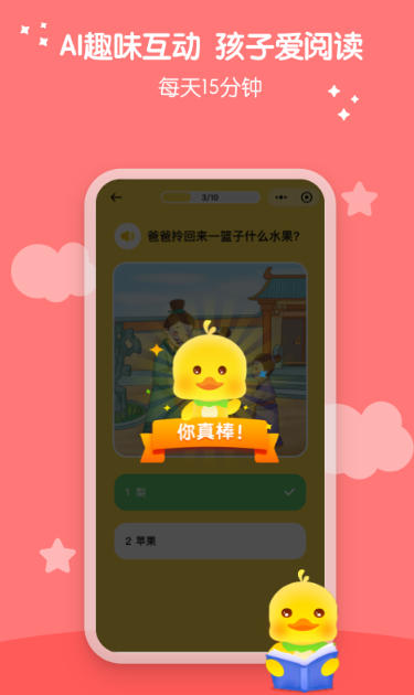 采用AI互动式教学,通过趣味的卡通教程视频、好玩的绘本故事等方式,增加阅读的趣味性。