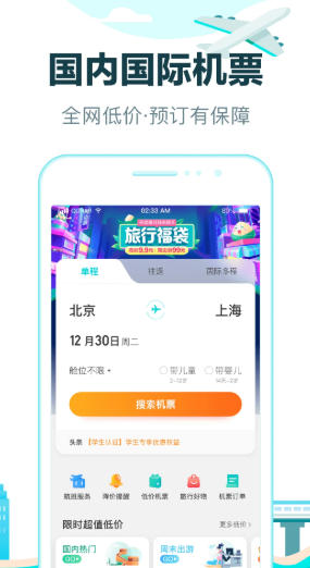 往返同屏选:全球首创国内机票往返机票同屏搜索功能,往返时间、价格一页可看,告别记不清去程起飞时间、航班号的历史。