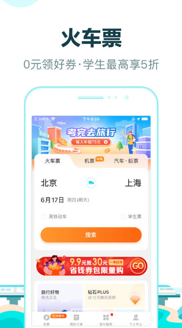 火车票预订:提供全国所有火车票线路预订服务,并支持春运及节假日高峰期智能出行方案。用户可一键切换机票、火车、汽车等多种交通方式,并享受中转、多买几站、上车补票、同车换座等多种组合线路推荐。