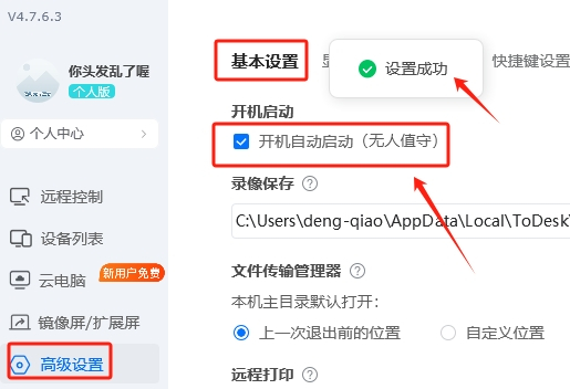 2、设置开机自启动(高级设置 -> 基本设置 -> 勾选开机自动启动);