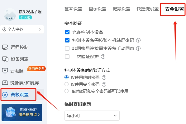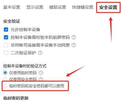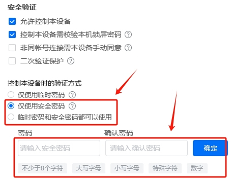 3、设置安全密码(高级设置 -> 安全设置 -> 勾选仅使用安全密码或两者均可使用,防止临时密码刷新导致无法连接);