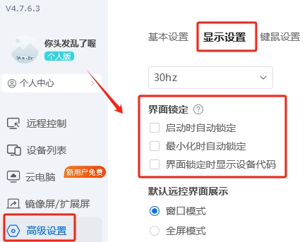 1、点击「高级设置 - 显示设置」,在界面锁定中勾选 “启动时自动锁定” 和 “最小化时自动锁定” 即可锁定客户端(扫码登录和验证码登录需先设置安全密码);