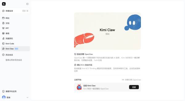 注册/登录 Kimi 账户:访问 Kimi 官网,从左侧边栏打开 Kimi Claw。