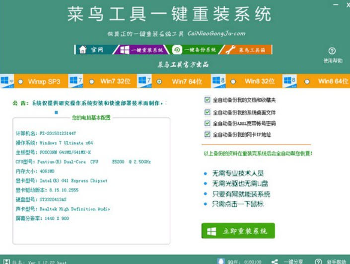 菜鸟工具一键重装系统完美支持WINxp/Win7 32位/WIN7 64位/Win8 32位/WIN8 64位系统互相转换。
